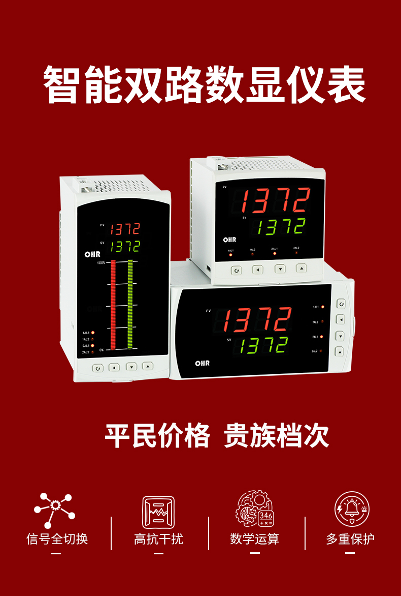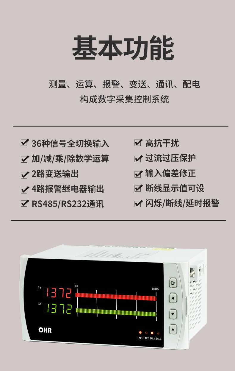 OHR-E200系列雙回路數字顯示控制儀針對現場溫度、壓力、液位、速度等各種信號進行采集、顯示、控制、遠傳、通訊、打印等處理,構成數字采集系統(tǒng)及控制系統(tǒng),廣泛運用于電力、石化、冶金、輕工、制藥、航空等諸多領域。