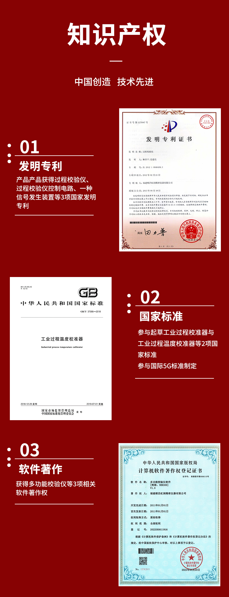 虹潤公司是專業(yè)生產(chǎn)過程校驗儀的國家專精特新“小巨人”企業(yè)。生產(chǎn)的多功能過程校驗儀,具有小巧式,大彩屏,多種測量與輸出類型,溫度與信號互查,精度可達0.03%FS,手機充電電池等特點。產(chǎn)品獲得過程校驗儀、過程校驗儀控制電路、一種信號發(fā)生裝置等3項國家發(fā)明專利,起草工業(yè)過程校準器與工業(yè)過程溫度校準器等2項國家標準,參與國際5G標準制定,取得多功能校驗儀等3項相關(guān)軟件著作權(quán)。產(chǎn)品廣泛應(yīng)用于電力、化工、冶金、制藥、實驗室等行業(yè)過程控制中,現(xiàn)場設(shè)備的調(diào)試與校驗。