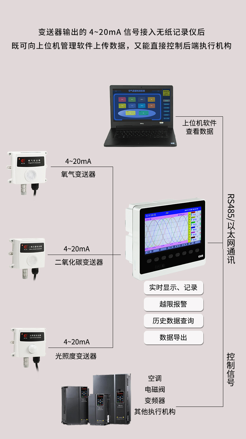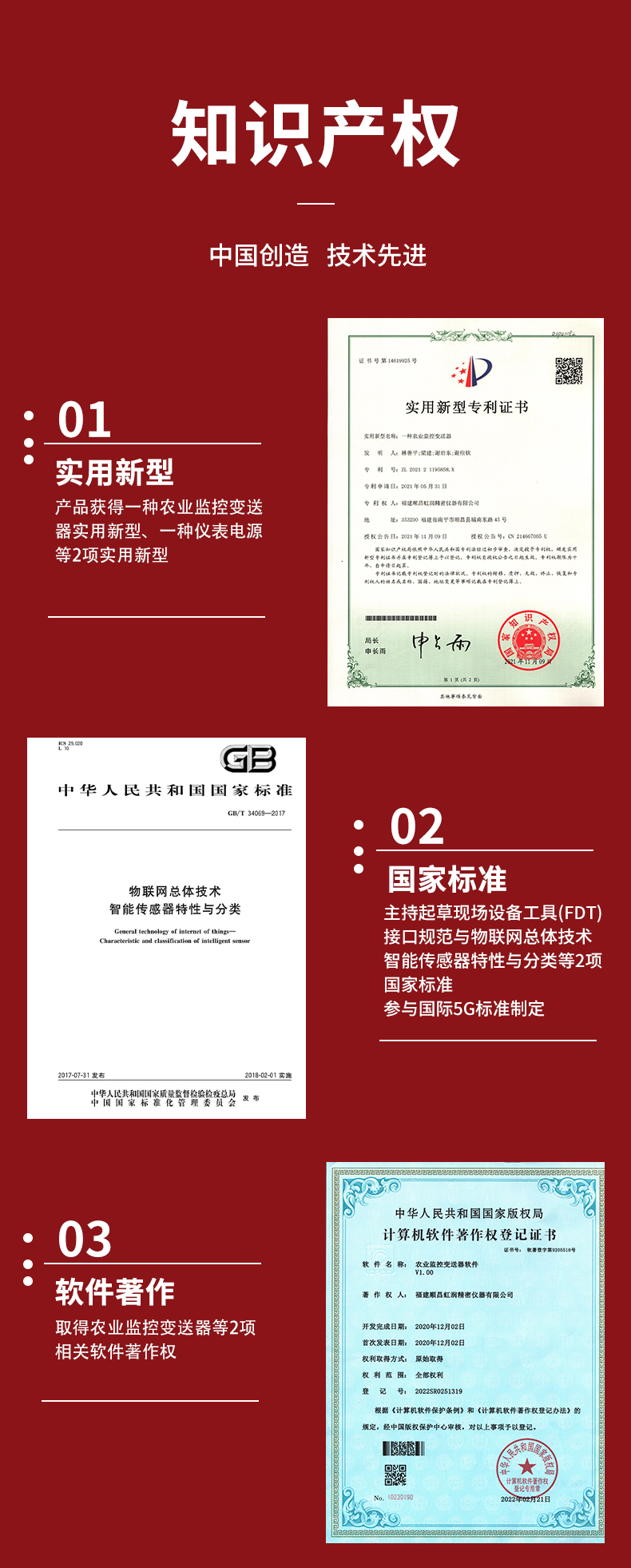 虹潤公司是專業(yè)生產(chǎn)環(huán)境監(jiān)測儀表的國家專精特新“小巨人”企業(yè)。生產(chǎn)的二氧化碳變送器,具有新型紅外檢定技術,自動溫度補償,響應靈敏,低功耗,模擬量變送輸出或RS485通訊等特點。產(chǎn)品獲得一種農(nóng)業(yè)監(jiān)控變送器、一種儀表電源等2項實用新型專利,主持起草現(xiàn)場設備工具(FDT)接口規(guī)范、物聯(lián)網(wǎng)總體技術智能傳感器特性與分類等2項國家標準,參與國際5G標準制定,取得農(nóng)業(yè)監(jiān)測變送器等3項相關軟件著作權。產(chǎn)品廣泛應用于機房、配電站、地下車庫、工廠倉庫、食品儲存、養(yǎng)殖場、果蔬林園等環(huán)境場合對二氧化碳濃度的檢測。