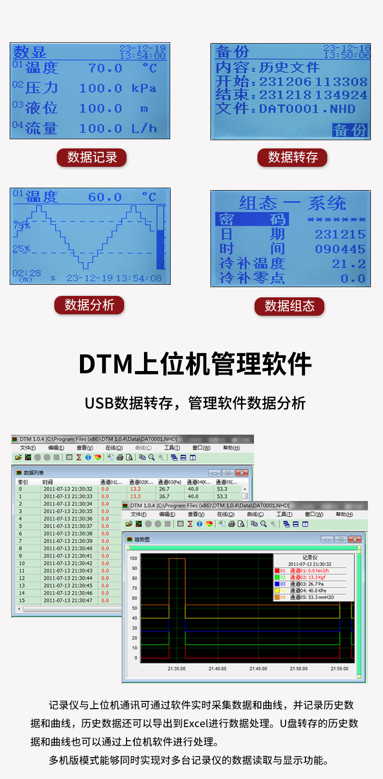 NHR-PR30系列數(shù)據(jù)采集器采用高速、高性能32位ARM微處理器,多重保護(hù)和隔離設(shè)計(jì),抗干擾能力強(qiáng), 可靠性高。顯示功能強(qiáng)大,具有實(shí)時曲線畫面、數(shù)顯畫面。儀表采用主副機(jī)結(jié)構(gòu)設(shè)計(jì),主機(jī)可提供4路萬能信號輸入,通道間相互隔離,RS485 通訊、以太網(wǎng)通訊等功能,連接副機(jī)可將I/O容量擴(kuò)展至8路輸入。